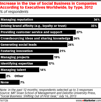 除了营销和沟通外,社交媒体也逐渐用作为倾听客户、监控情绪和创造优质品牌形象的工具。许多调查认为建立声望是社交媒体最大的价值。其中,根据MIT斯隆管理学院(MIT Sloan School of Management)和德勤大学出版社(Deloitte University Press)做的一项调查里提到,2011到2012年期间,在社会化商业策略中,管理声望的作用增长至36%,几乎与建设品牌亲和力同等重要。